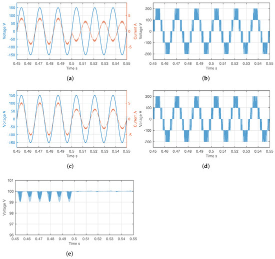 In order to further confirm the correct operation of the modulation strategy, Figure 9c presents the capacitor voltage . Considering that, in this case, the battery employed as the main energy storage element has a rated voltage of 100 V, the results demonstrate that the parallel connection between the storage units provides an effective balancing approach, allowing the voltages to remain balanced throughout the whole test.