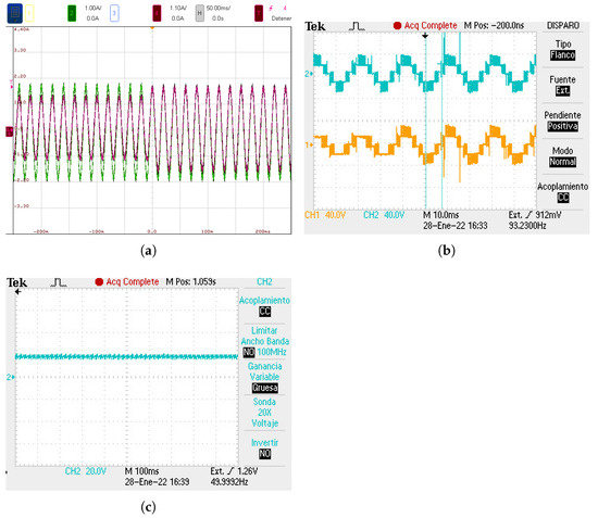 Initially, both AC systems present currents in phase with their corresponding voltages, and hence both grids are sinking power from the HESS, following the definition in Figure 1. Since the battery is supplying the energy, the test illustrates the bidirectional power flow capabilities of the CMOM converter in both AC output ports. From the results presented in Figure 7a–d it can be seen that current references of system 1 and 2 are, respectively, 4 A and 5 A, demonstrating the capabilities of the proposed modulation technique to maintain the outputs decoupled and sink different power levels as requested by each of the grid-connected ports.