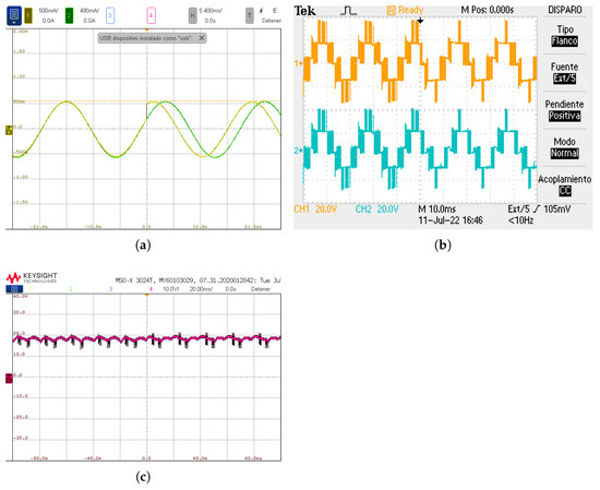 To validate the operation modes of the system with different amplitudes of the modulating signals for systems 1 and 2, the references for AC system 1 and 2 are defined with the same phase and frequency (50 Hz). The modulation index reference for the AC system 2 is kept controlled to an amplitude of 0.7, as is presented in Figure 9a, obtaining an AC output voltage with five voltage levels, as shown in Figure 9b. In addition, the modulation index reference of the AC system 1 is equal to 0.5, hence leading to an AC output voltage with three voltage levels, as can be seen in Figure 9b. Then, a step change in the modulation index amplitude of AC output 1 takes place, reaching a final value of 0.7. After the change, it can be seen how now exhibits a 5-voltage level waveform. In this way, the decoupled operation in both AC outputs under different modulation indices is validated.
