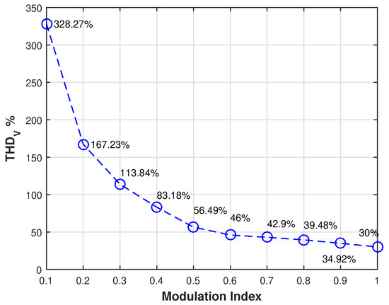 The steady-state performance of the proposed modulation scheme for the CMOM converter is analyzed in the following section. The converter is operated under normal conditions to be analyzed at different modulation indices. Figure 11 shows the THD of the output voltage. It is important to note that the results presented in Figure 11 are valid for both AC outputs ( and ). For a higher modulation index, the number of voltage levels increases to a maximum of five steps, and therefore, the THD of the voltage is reduced significantly in both AC outputs, which benefits the quality of the current being sinked or supplied to each AC system.