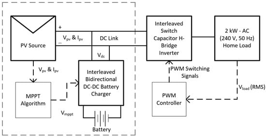 The current energy crisis has been caused by global warming and an ever-increasing demand for energy. It is becoming more and more essential in today’s society to develop and improve sustainable energy management systems. One of the main sources of renewable energy is the use of solar energy, specifically a photovoltaic (PV) energy management system. This paper looks at one of the key elements of a PV energy management system, the battery charger. Battery charging allows generated solar energy to be stored and used later when the system is not generating from sunlight. It is therefore increasingly important that a traditional conventional solar energy management system provides efficient conversion and inversion to avoid losses. The designed energy management system used in this study contains a battery to provide a supplement of power to the home load when the energy generated from the PV panels is not sufficient to meet the home load demand. This can be during partial shading conditions or even during the night where the load requirements are typically reduced for residential applications. The battery requires a bidirectional charger circuit to allow it to be charged and discharged. It is important to ensure that the DC/DC conversion is highly efficient such that the maximum power point (MPP) is utilized to drive the battery charger circuit in this system. The circuit must utilize the MPP for various environmental conditions. Figure 1 shows the overall system configuration; it includes the PV source, interleaved switched capacitor H-bridge inverter, and the interleaved bidirectional DC/DC battery charger. The MPPT and PWM control blocks are also shown in Figure 1.