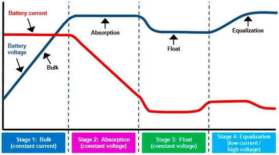 When designing a PV energy management system, the size of the battery must be suitable to supply the home load for the system in an event where Vpv is zero. For the longevity of the battery, the battery must not be totally or nearly totally discharged to support the home load when the PV panel is not generating any electricity. This value is usually below 25% of the battery’s value. An optimal battery charge cycle is shown by the four stages presented in Figure 3. Stage 1: Bulk, a constant current mode stage of battery charging cycle sees the battery charge up to 80% of its capacity. Stage 2: Absorption, a constant voltage mode. For a 12 V battery in this phase of the charging cycle, the battery voltage is held at 14.5 V and the battery current reduces; during this time, the last 20% of the battery is charged. The battery voltage is held at 14.5 until the battery current reaches approximately 5% of its rated current value. Stage 3: Float, a constant voltage mode, when the battery current reaches 5% of its rated current value the battery voltage drops to 13.5 V. This voltage allows the battery to maintain and hold its charge and does not harm or damage the battery. Stage 4: Equalization, a low-current and high-voltage mode; this protects the electrolyte within the battery via a process called de-sulphation. Whilst this paper does not specifically focus on improving battery life expectancy, it is still important to show that the proposed system can protect the battery from over-charging and over-discharging. A state of charge (SOC) controller has been designed as part of the control strategy for the proposed system and is described below in Section 2.