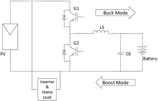 This topology operates in boost (battery discharging mode) or buck (battery charging Mode) and the basic explanation for the modes of this circuit are as follows: