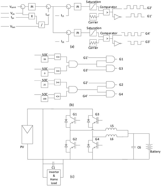 (a) P&O MPPT algorithm and current control strategy. (b) State of charge controller. (c) DC/DC battery charging circuit.