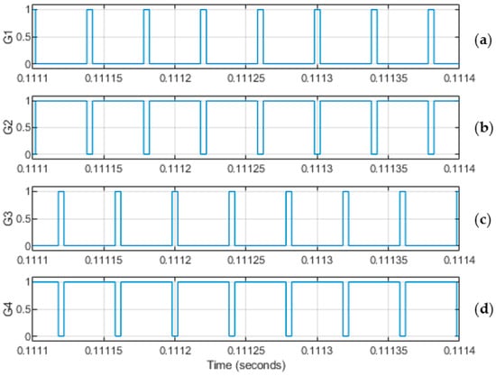 To validate the performance of the control strategy, the next experiment required collecting the data from the four gate pulses and plotting them on the same figure to observe and compare the pulse characteristics. From the simulations carried out, Figure 7 is a chart of the four gate pulses generated by the combined MPPT and current controller circuit. These are the gate pulses used to control the battery charger circuit. The measured output of the gate pulses shows that Figure 7a,b are 180 degrees out of phase with Figure 7c,d; therefore, the IGBTs are controlled as interleaved switch pairs.