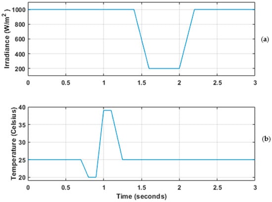 The pulses shown in Figure 7 confirm that the control strategy successfully interleaves the gates of the two switch pairs. As can be observed from Figure 8, the temperature decreases from 25 °C to 20 °C at 0.65 s to 0.80 s before moving up from 20 °C at 0.9 s to 40 °C by 1 s. The irradiance stays at 1000 W/m2 until 1.4 s where it drops to 200 W/m2 by 1.6 s, at 2 s it increased from 200 W/m2 to 1000 W/m2 by 2.2 s before remaining at 1000 W/m2 until 3 s.