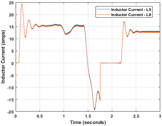 To adequately test the system performance, it is necessary to vary the input conditions for the PV panel and observe the system’s response to changes in these variables. Figure 8 shows how these variables are varied for the duration of the simulated timeframe. The inductor currents L5 and L6 are shown in Figure 9.