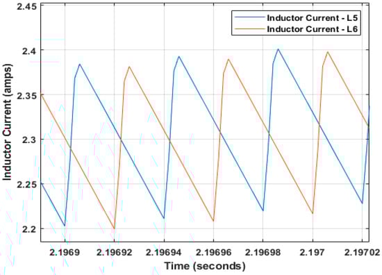 The interleaving of the two inductor currents can be observed when zooming in closer to the inductor current of L5 and L6; this is shown in Figure 10 where the orange line shows L5 and the blue L6.