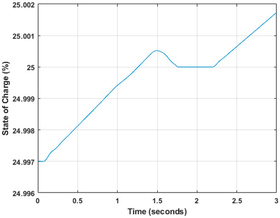The performance of the battery for the duration of the simulation represents important data to gather and analyse. Figure 11 shows the state of charge of the battery. The initial state of charge of the battery has been set to 24.997% as this will allow a demonstration of the state of charge controller to be observed within the duration of the 3 s data gathering in MATLAB/Simulink. Figure 11 shows that the battery is charging until the point at which the irradiance falls and when this happens, the battery is required to supplement the 2 kW home load as the PV panel is no longer producing the required power. The battery begins to discharge at 1.5 s to support the 2 kW home load. However, at the point where the battery reaches 25% charge, the state of charge controller circuit prevents the battery charger circuit from discharging the battery (to keep in the nominal range and prolong battery life). In this case, for a standalone system the home load would experience an outage/dip in power.