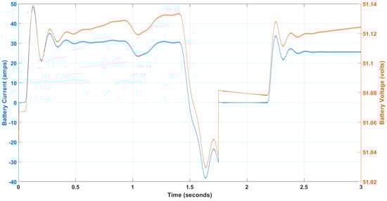 The investigation focuses on the battery charger; therefore, the performance of the battery current and voltage should also be observed. Figure 12 shows how the battery current (blue) and voltage (red) perform for the duration of the simulation, particularly when the input conditions are varied.