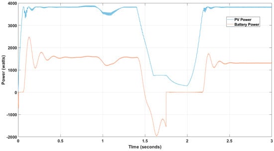 Another way to evaluate the circuit performance is to observe the power for both the PV panel and the battery; this is shown in Figure 13. The envisaged pattern of behavior is that the battery power should mimic the PV power curve; this would confirm that the battery charging circuit is performing in harmony with the PV panel to supply the home load. The point at which this synchrony is not visible in Figure 13 is where the battery reaches the 25% discharge threshold. The overall performance of the global system can be validated to operate as required as can be observed in Figure 13.