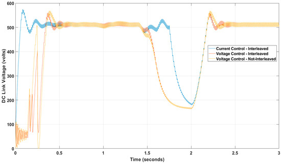 The result of this experiment is displayed in Figure 14, which shows a comparison of the DC link voltage for three types of battery chargers. The strategy utilized in this global system is the current-controlled interleaved strategy, which is shown in blue. The red line in Figure 14 shows the DC link voltage for a voltage-controlled interleaved strategy and finally the yellow shows the DC link voltage for a voltage-controlled strategy without an interleaved stage.