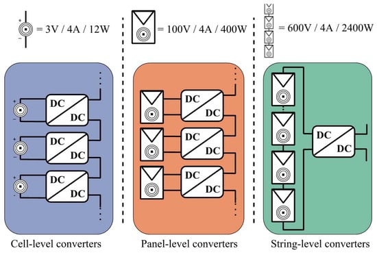 The increase in yielded energy resulting in the addition of a DC/DC stage greatly relies on the scale at which it is deployed, or, in other terms, the granularity of the converters. In the case of DC/DC converters, this study presents the following granularities: string level, panel level, and cell level. These granularities are depicted in Figure 1.