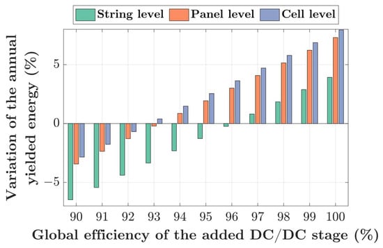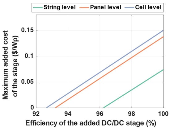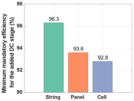 We can see that the level of granularity has a direct impact on the efficiency requirement for the additional stage. With a diminishing scale of power, the efficiency requirements are relaxed from 96.3% for the string-level converter to 92.8% for the cell-level one. On the contrary, we can observe that the gap in requirement tolerance is higher when it moves from string to panel levels compared to panel to cell levels.