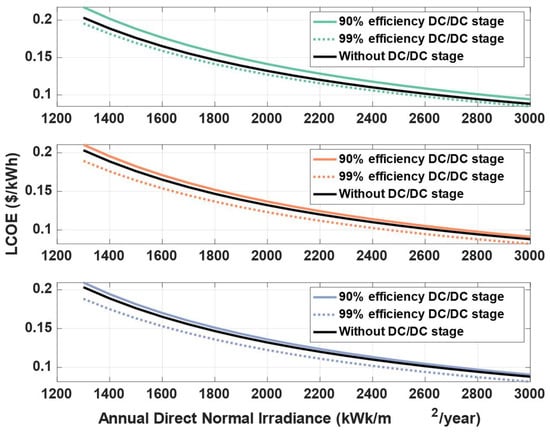 Figure 4 shows that for an annual direct normal irradiance of 2000 kWh/m2/year, a cell-level added DC/DC conversion stage (in blue) with 99% efficiency allows a decrease of 0.01 USD/kWh compared to the current industrial solution. With increasing irradiance, an added stage with the same efficiency holds less savings potential. The same cell-level stage at 3000 kWh/m2/year decreases the LCOE only by 0.008 USD/kWh.