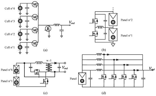 Simple topologies can be found, such as buck, boost or buck boost. The more complicated ones represent attempts at answering some specificities of the CPV cells, and are represented in Figure 6. For example, in [32], it consists of an interleaved buck topology. Each of its input is directly linked to a junction of the CPV cell, mainly to overcome spectral mismatch and the necessity of lattice-matched junctions [33]. Article [34] proposes a high-gain DC/DC topology to directly feed one panel to the DC bus of a grid-tied inverter.