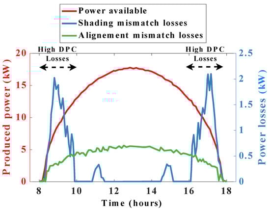 To compare the converters, we base our work on the different powers provided in [17]. The total theoretical power during a clear-sky day scenario received by a pedestal 28.5 kWp tracker is displayed in Figure 7 in red on the left axis. The figure also represents the losses associated with the shading mismatch (in blue) and with the alignment mismatches (in green), the values of which can be read on the right axis. In the case of a conventional inverter-level-based MPPT, both the losses displayed in the figure must be subtracted from the total available power to represent the actual yield of the system.