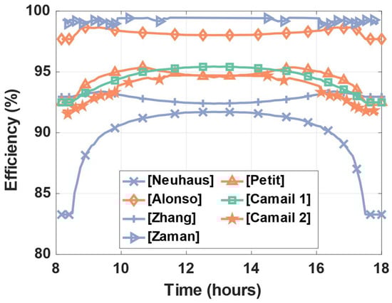 Considering the cell-level converters (blue line), we can see a large disparity of efficiencies, with a clear advantage for the differential power processing unit. It limits the low efficiency value due to the processing of low power at the very start and very end of the day. All the other topologies exhibit the higher proportion of losses during this period.