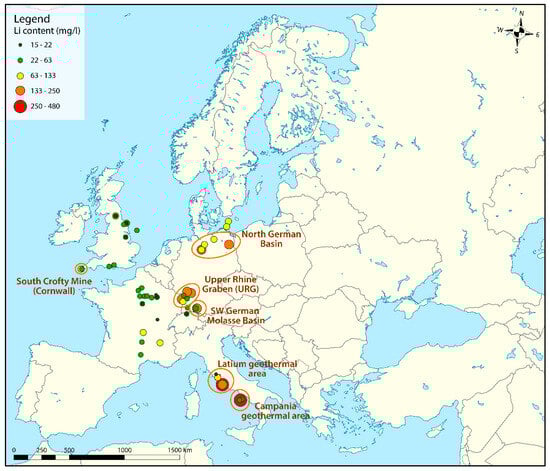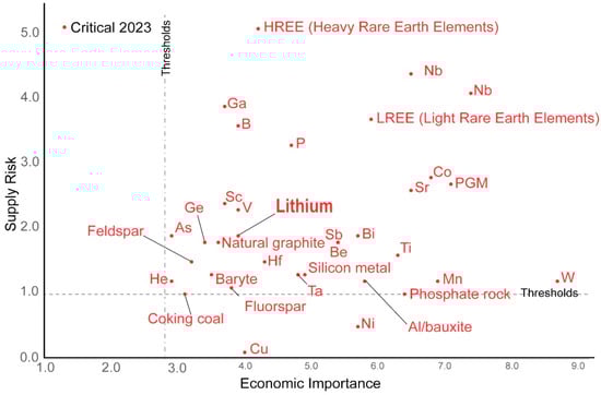 Raw materials are essential to EU industry and are at the beginning of every value chain. Among the non-energy, non-agricultural raw materials the assessed by the European Commission, some have been identified as critical on the basis of objective criteria, including their economic importance and supply risk [9] (Figure 1). For instance, there is an increasing need to explore alternative and sustainable sources of lithium to meet the growing demand in energy, manufacturing, and medical sectors. Innovative extraction technologies for lithium from geothermal brines and seawater are emerging as a potentially viable and environmentally friendly solution [10]. A recent study further highlighted that deep geothermal plants can offer a low-carbon alternative to conventional lithium extraction methods [11]. G. Balaram explored potential future alternative resources for rare earth elements and presented the opportunities and challenges associated with them [12]. More specifically, Sanjuan et al. provided an update on the geochemical characteristics of lithium-rich geothermal brines in Europe and discussed their implications for potential lithium resources [13,14].