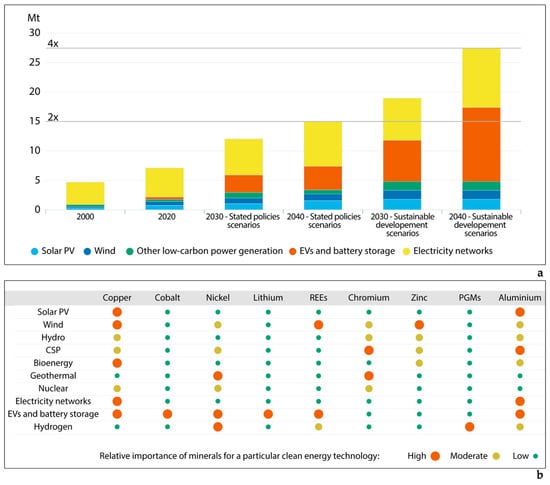 Top (a), Critical elements needed for clean energy technologies, from [37] modified bottom (b), total mineral demand for clean energy technologies by scenario, 2010–2040 (2020 is the base year). From [37], modified.