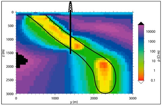 Notably, these techniques are particularly effective due to the low electrical resistivities characteristic of metallic ore mineralizations, which usually hover around or below 1 km [44]. While some studies, such as Di et al., have successfully used MT methods to explore deep-seated gold deposits, other studies have consistently identified low-resistivity zones indicative of surrounding metalliferous formations [45]. Advanced numerical procedures for interpreting MT measurements are also readily accessible, as exemplified by [42], which showcases a low-resistivity body at an approximate depth of 2 km (Figure 5). Advanced 3D inversion tools further enrich the MT data interpretation framework [46]. Collectively, MT techniques and their corresponding interpretative models represent a promising avenue for locating ultra-deep ore bodies and catalyzing the subsequent application of CHPM.