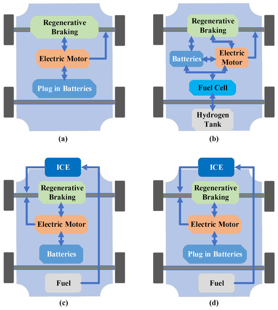 Drive technologies in (a) BEVs, (b) FCEVs, (c) HEVs, and (d) PHEVs.