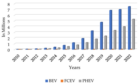 In 1832, Robert Anderson created the first small-scale electric carriage, while inventors from Hungary, the Netherlands, and the United States also developed battery-powered vehicles [21]. Today, the global sales of electric vehicles (EVs) have risen to about 3.2 million as of 2022, showing a yearly growth rate of approximately 43% [22,23]. Figure 2 demonstrates the number of EVs on the road globally. EVs fall into four categories: hybrid electric vehicles (HEVs), plug-in electric vehicles (PHEVs), fuel cell electric vehicles (FCEVs), and battery electric vehicles (BEVs). The different drive technologies used in EVs are shown in Figure 3, and more details can be found in [24].
