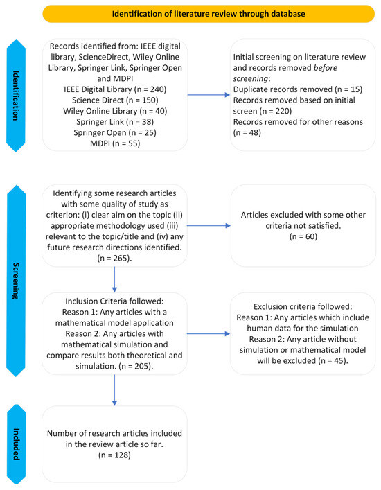 In the initial phase of this research, we conducted a literature review using general search terms. The search spanned well-known engineering databases, including the Institute of Electrical and Electronics Engineers (IEEE) digital library, ScienceDirect, the Wiley Online Library, Springer Link, Springer Open, and the Multidisciplinary Digital Publishing Institute (MDPI). We accumulated research articles from diverse sources, including library databases, Google Scholar, and a personal database comprising all research articles. Following strict inclusion and exclusion criteria, we executed a systematic literature review and conducted a meta-analysis. Additionally, in some instances, research articles were accessed from ResearchGate, a social networking platform for researchers. While some research articles were freely accessible, others were obtained through requests. To identify the most appropriate mathematical model and discern research gaps, we categorized research articles based on the mathematical models and simulations employed in the mathematical applications.