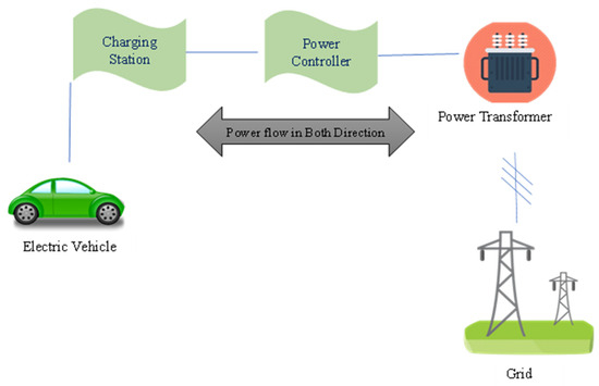 In the field of electric vehicles, there have been significant advancements in bidirectional power transfer systems. One such system, presented in [64], is a peer-to-peer (P2P) energy trading mechanism between energy service providers and customers. The system uses a fuzzy-based approach to match the energy trades between single consumers to multiple providers and multiple consumers to multiple providers. Additionally, other studies [65,78] proposed an optimization model for the charging infrastructure of EVs, which aims to minimize the overall installation, maintenance, and operation costs while ensuring system reliability checks based on DC power flow to guarantee the quality of service (QoS). QoS, in this case, is defined as the overall disposable charging time for EVs to reach their overall travel distance. The future research will focus on linearized approaches to run EV power system reliability checks based on AC power. The bidirectional power transfer between an EV and the grid [79] is depicted in Figure 6.