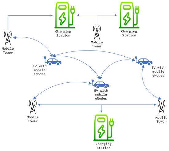 The field of intelligent transportation systems (ITSs) is a fascinating area of research that explores the potential benefits of incorporating electrical vehicle communication to enhance the vehicular performance and ensure a high quality of service level. A comprehensive overview of various ITS applications can be found in [84]. Typically, EV charging is accomplished by physically connecting the EV to a charging outlet. However, innovative wireless power transfer methodologies for EVs have been introduced in [85,86], while a dynamic wireless power transfer technology for power transfer in moving EVs is presented in [87]. A cloud-based framework has been developed to efficiently manage EV charging during peak hours and ensure grid stability [88]. In the realm of EV charging advancements, the Internet of electric vehicles (IoEV) is a new technology that highlights EVs’ intelligence and their equipped communication tools. In [89], several vehicular communication network technologies related to the IoEV are presented, along with the current challenges and solutions within the field [90]. EVaaS, or electric vehicles as a service, employs cutting-edge vehicle-to-grid (V2G) technology to enable compatible EVs within the distribution network to share energy with the grid or customers. This innovative approach, detailed in [91], allows the seamless integration of EVs into the energy grid, while optimizing their utilization for the benefit of both the grid and consumers. EV communication is crucial for exchanging information such as the state of charge (SoC), EV location, charging requirements, power rating, and available charge in the EV [92]. A simplified EV communication model featuring mobile nodes, roadside stations, and charging stations is depicted in Figure 7.