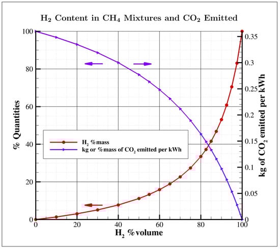 Correlation between volume and mass percentages within methane/hydrogen blends, and its consequential effect on emissions (considering an assumed electrical efficiency of 55% in the computation). The percentage values on the left are in reference to pure methane.