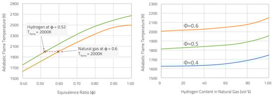 Moreover, hydrogen has a considerably broader flammability range than natural gas, leading to heightened concerns regarding environmental, health, and safety aspects during both hydrogen transportation and combustion. Although it has recently been observed [7] that mixtures containing higher concentrations are slower to ignite compared to those with higher concentrations at low temperatures (below , for hydrogen combustion, the self-recombination of radicals leads to chain propagation which inhibits reactivity, whereas for methane combustion, the reaction between radicals and leads to chain branching, increasing reactivity), for higher temperatures hydrogen largely enhances the reactivity of fuel blends: the ignition delay time decreases [8,9,10,11]; at room temperature and pressure, the flammability limits (0.1–7.1) are well wider than those of natural gas (0.5–1.67); the flame speed is higher [12] and the critical strain rate increases, thus reducing potential flame quenching [13,14]. At a fixed equivalence ratio (), the hydrogen/air premixed flame burns with an adiabatic flame temperature higher than the corresponding natural gas one (see Figure 2, left). In the same way, fixing the equivalence ratio, the increase in the hydrogen content in a methane/hydrogen mixture can rise the adiabatic flame temperature (see Figure 2, right).