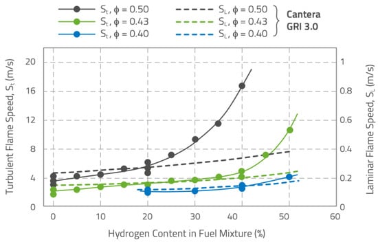 Figure 3 reports data on laminar and turbulent flame speed from [15,16] for fuel mixtures with hydrogen content up to 50% vol. The data are specific to lean premixed fuel/air mixtures () at 5 bar, preheated at , flowing at , and with a 15% inlet turbulence intensity. Laminar flame speed values were calculated based on the GRI3.0 chemical mechanism. The data on turbulent flame speed show the unexpected effects of increasing the hydrogen content. Initially, there is a moderate, nearly linear increase in turbulent flame speed, following the trend of calculated laminar flame speed, but the linearity varies with the equivalence ratio, is longer for leaner mixtures. This suggests complex interactions between hydrogen addition and combustion properties. The differences (evident in the richer mixtures in Figure 3) highlight the presence of both the chemical kinetics and physical (diffusivity, thermal conductivity, turbulence) effects of the hydrogen addition: the linear trends depict the chemical kinetics reaction properties of the fuel gas mixtures; beyond the limits of the linear region, the turbulent flame speed rapidly diverges (similar trends are observed for the leaner conditions but shifted towards higher hydrogen concentrations). Hence, besides the chemical kinetics effects influenced by hydrogen, which are reflected in changes in the laminar flame speed, the physical properties of hydrogen also accelerate the consumption rate of the fuel species. One of the physical effects is that the presence of hydrogen in air/hydrocarbon blends, especially at the leaner equivalence ratios, decreases the Markstein length, even to negative values [17,18]. Thus, a positively stretched flame increases its laminar combustion velocity, in contrast to a pure hydrocarbon/air flame (with a positive Markstein number along its whole flammability limit), whose laminar combustion velocity is increased when negatively stretched. The increase in hydrogen content is shown to lower the thickness of the flame pre-heat zone, while the heat release zone seems to be insensitive to turbulence effects, at least in the broadened preheat-thin reaction zone [19]. Some other physical effects of the hydrogen addition will be discussed in Section 2.1.