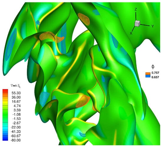 Hydrogen, and light species in general, diffuse preferentially with respect to other species in a mixture. In recent decades, so-called asymptotic theories [29,30,31] have been developed which predict the existence of perturbations (in specific wavelength ranges) that are particularly effective in destabilizing combustion processes, which strongly depend on the Lewis number of the mixture. The Lewis number (Le) represents a measure of the disparity between thermal and mass diffusivity, through their ratio: therefore, a hydrogen-rich mixture, which has a mass diffusivity that is extremely greater than the methane molecule, will be characterized by a Lewis number less than unity. In a premixed combustion, this makes the local equivalence ratio lower or higher than the inlet nominal equivalence ratio of the considered fuel blend depending on the local flame curvature. An example is provided in Figure 4 for a —air flame at a nominal and 20% volume content [37], where the instantaneous flame surface (identified by means of the progress variable value related to the maximum heat release) is shown, evidencing local hydrogen enrichment in positive curvature regions, and a decrease in the equivalence ratio in negative curvature regions. This mechanism changes flame speed locally, and tends to enhance the wrinkling of the flame front and the burning rate.