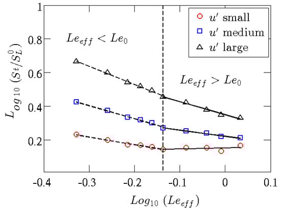 Ratio between turbulent and laminar flame speeds versus the effective Lewis number, as defined in [40], in a premixed Bunsen flame, parameterized with turbulence intensity of the jet, from studies in [38,39].