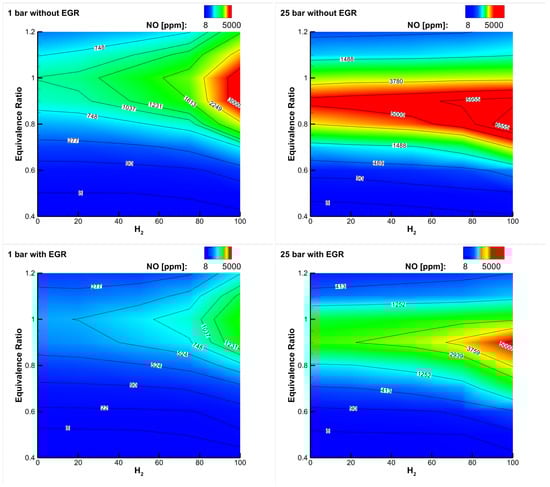emissions in ppm vs. equivalence ratio and hydrogen content for a blend reacting with air without and with dilution through exhaust gas recirculation (EGR). Two pressures are considered: 1 bar (left) and 25 bar (right). The initial temperature of reactants changes with the hydrogen content: without EGR, it is in the range of 750–820 K, and with EGR, it is in the range of 800–850 K, decreasing while is increased [50].
