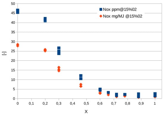 Figure 7 shows the quantity of expressed in parts per million (ppm), scaled to a value of oxygen in the combustion equal to 15%, as well as in mass normalized by the fuel energy actually converted into heat, to take into account the different composition of exhausts while increasing the hydrogen content [39]. Additionally, in this way, the emission values of machines of significantly different sizes (power) can be compared. It is observed that, above a hydrogen mole fraction of 45–50%, emissions decrease dramatically. This is due to the regulation strategy adopted in [39]: while the hydrogen content is increased, the equivalence ratio is decreased, thus lowering the flame temperature and thermal contribution (the most relevant). In fact, the temperature changes from about 2100 K for the methane flame to nearly 1600 K for the hydrogen one.