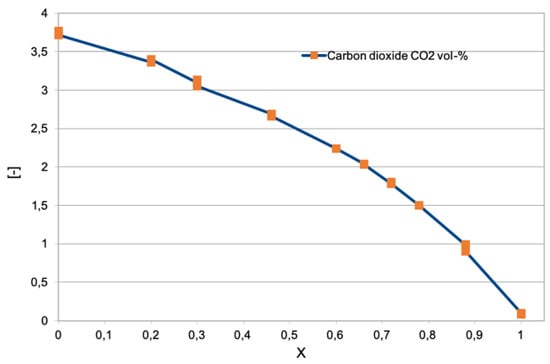 Figure 8 shows the results of the sampling of the carbon dioxide emitted in the same experiment [39]. As the percentage of hydrogen expressed as molar fraction increases (0, pure methane; 1, pure hydrogen), the carbon dioxide content drops until it reaches zero when the mixture is made up of only hydrogen and air. The results are in agreement with the chemiluminescence emission described later in Figures 11 and 12. As expected from the numerical calculation data in Figure 1, the presence of carbon dioxide is significant, even at very high mole fraction values.
