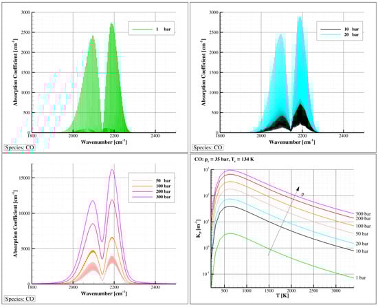 The radiative absorption properties hinge on the absorption coefficient, denoted by . In gases, this coefficient often exhibits significant variations with respect to wavelength, temperature, and pressure. It also increases in direct proportion to the concentration of participating species. While solid surfaces can generally be assumed as opaque, the absorption or emission properties of gases exhibit irregularities within the wavelength domain, becoming particularly noteworthy at temperatures below a few thousand Kelvin. As the temperature increases, the absorption coefficient for cold lines diminishes, but hot lines emerge at higher wavelengths, slightly increasing the absorption coefficient. Elevating the pressure results in spectral line broadening, primarily due to molecular collisions [57]. This broadening leads to wider and more overlapping lines, especially at higher pressures, rendering the gas more “gray” or opaque. Consequently, the amplitude of the spectral absorption coefficient significantly increases, as depicted in Figure 9 and as also reported in [58,59] (p. 138). An appropriate and practical average absorption coefficient for characterizing the total emission from a volume element within an absorbing medium is the Planck mean absorption coefficient. This coefficient solely depends on local properties and can be tabulated. Presently, the Planck mean absorption coefficients, which were estimated in the past [57] (pp. 253–324), can be more accurately computed directly from high-resolution spectroscopic databases, such as HITRAN [60] and HITEMP [61], as demonstrated in the study by [62]. The newer databases tend to yield absorption coefficients that are generally higher than those obtained using older databases, particularly at higher temperatures and pressures: Figure 9 (bottom right) shows this effect for carbon monoxide.