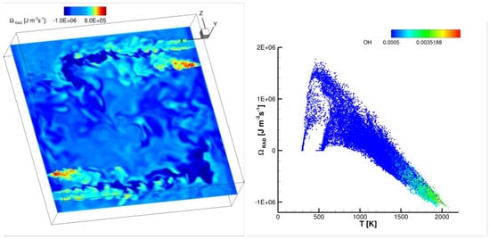 In systems where RTE is a significant factor, it has been demonstrated that radiation can be considered equivalent to a substantial nonlinear diffusion term. In fact, the transfer of heat through radiation can function as a preheating mechanism, similarly to heat conduction. As a result, this preheating effect contributes to higher flame speeds, as discussed in the work by Mercer in [68]. As an example, Figure 10 shows an instantaneous distribution of the radiative source term in the energy equation in a non-premixed cyclonic combustor [69] burning air and hydrogen in a MILD combustion regime. The source term is estimated by means of the M1-radiation model [70]: its distribution reveals regions exhibiting heat losses (negative radiative source term) or preheating effects (positive source). The distribution of the radiative source term versus temperature is also shown at the bottom of the same figure, colored by means of the OH radical mass fraction: regions reacting at higher temperatures with higher OH concentrations lose heat, while colder non-reacting regions (jets, identifiable in the planar section of Figure 10, top) with lower OH contents are preheated.