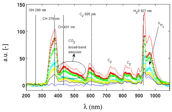 Figure 11 shows the spectra of radiant energy emitted by flames in [39] with increasing hydrogen contents. The arrow with defines the direction in which the molar fraction of hydrogen in the methane/air mixture increases. It starts from a pure methane flame, up to a pure hydrogen flame. The figure also shows the spectral emission lines of the major emitting species. As the carbon content in the mixture decreases, the decrease in energy emitted by the species , , , , and is evident.