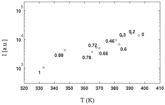 Integrated emission spectrum (over all wavelengths) for the various hydrogen contents vs. the temperature measured in the radial direction for the premixed Bunsen flames studied in [39]. Each experimental point is labeled with molar fraction of hydrogen. See Figure 1 for the equivalence between hydrogen mass and volume fraction.