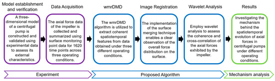 Figure 1 shows a flowchart for analyzing transient axial forces in centrifugal pumps under varying operating conditions using wavelet analysis and windowed multiscale dynamic mode decomposition. This study introduced the wmrDMD technique and applied it to analyze the transient features of the impeller’s axial force at three operating points: 1.0nr-1.0Qr, 1.0nr-0.4Qr, and 0.4nr-0.4Qr. Furthermore, cross-wavelet transform and wavelet coherence analysis were employed to examine the coherence characteristics of the axial force on the front and rear cover plates of the centrifugal pump. The objective was to uncover the spatiotemporal evolution mechanism of the axial force under variable operating conditions, offering insights for enhancing the energy efficiency and stability of centrifugal pumps.