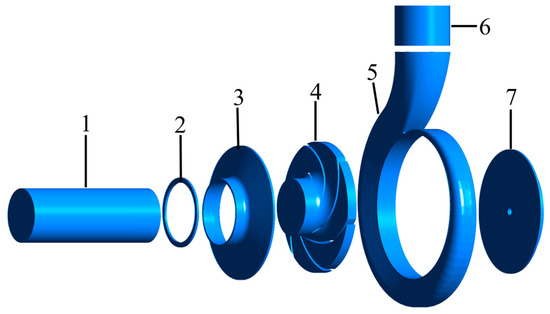Three-dimensional full flow field modeling of centrifugal pump. 1. Inlet extension; 2. front ring; 3. front pump chamber; 4. impeller; 5. volute; 6. exit extension; 7. rear pump chamber.