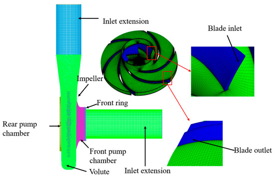 The computational domain of the centrifugal pump encompasses several crucial regions, including the inlet extension, outlet extension, volute, impeller, front pump chamber, and rear pump chamber. Given the spatial complexity and coupling of these regions, and with the aim of achieving precise computational results, a structured hexahedral meshing approach was employed using the 18.0 ICEM-CFD software. Moreover, the wall surfaces throughout the flow domain were refined with boundary layer grids.