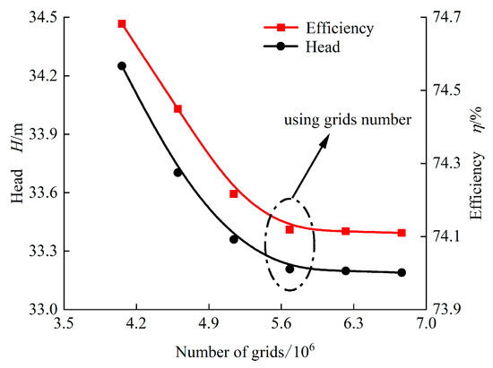To ensure the grid independence of the centrifugal pump, a grid independence study was performed. This study involved six different grid configurations. Numerical simulations were conducted using the 18.0 CFX software to obtain the pump head and efficiency results at various operating points. The obtained results were then compared and analyzed, as depicted in Figure 4.