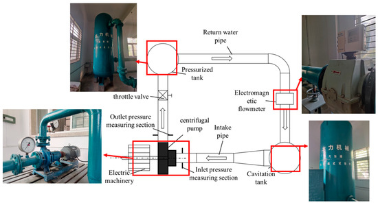 To analyze and validate the external characteristics of the centrifugal pump, hydraulic performance tests were conducted using a closed test rig at Northwest A&F University, as depicted in Figure 6. For flow rate measurement at the pump outlet, the E-MAG5100 electromagnetic flowmeter was utilized, which offers a measurement accuracy better than 0.5% of full scale (FS). Pressure measurement at the inlet and outlet was carried out using the YB-150 pressure sensor, with a measurement range of 0~6 MPa and an accuracy level of 0.25. The pump shaft power was calculated by determining the motor speed and torque.