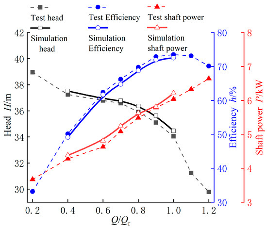 To enhance the credibility of the computational results, a comparative analysis was conducted between the calculated values and experimental data for the head, efficiency, and shaft power of the centrifugal pump operating at 0.4Qr-1.0Qr, as depicted in Figure 7.