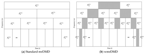 Subsequently, the mrDMD algorithm is administered to each and every temporal succession denoted as . In this investigation, a 50% interlap ratio was chosen for contiguous temporal matrices, with each matrix encompassing two-thirds of the frames featured in the conventional mrDMD analysis. This procedure yields the ensuing matrices, which constitute the superimposed regenerations pertinent to each mrDMD echelon.