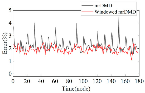 Figure 11 reveals that the reconstruction errors of the standard mrDMD range from 1.08% to 2.49%, whereas the reconstruction errors of wmrDMD range from 1.51% to 4.53%. It is worth noting that in Figure 11, standard mrDMD exhibits prominent errors primarily manifesting along the boundaries of each block. This occurs because the standard mrDMD introduces non-physical errors during the block partitioning process. In contrast, the wmrDMD algorithm effectively mitigates the non-physical errors between blocks. This indicates that applying the wmrDMD algorithm with the enhanced method can effectively alleviate the issue of divergence in comparison to the standard mrDMD, accurately modeling the time series data.